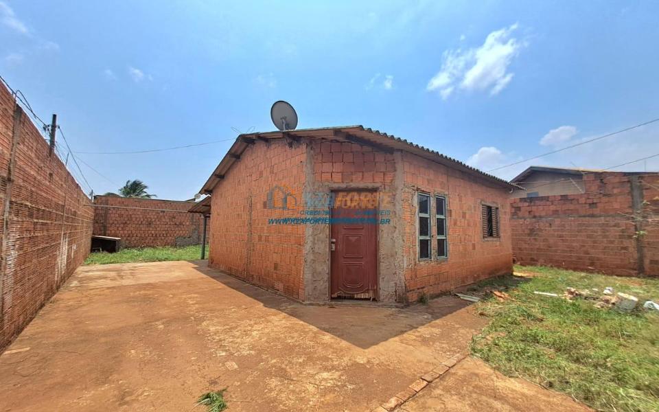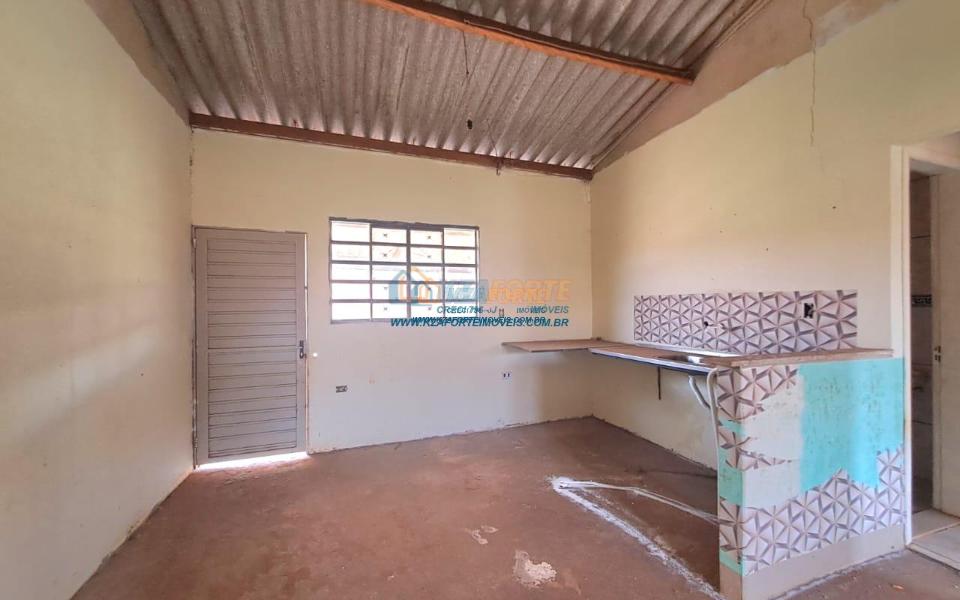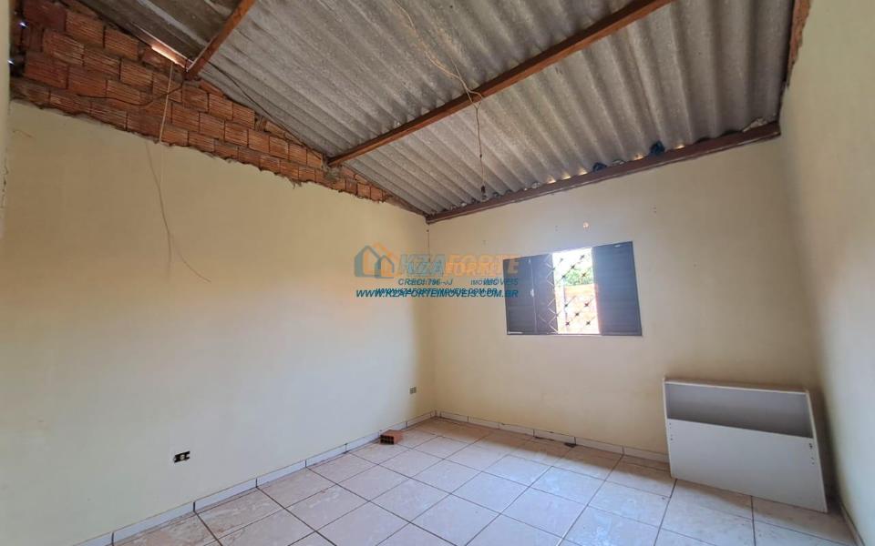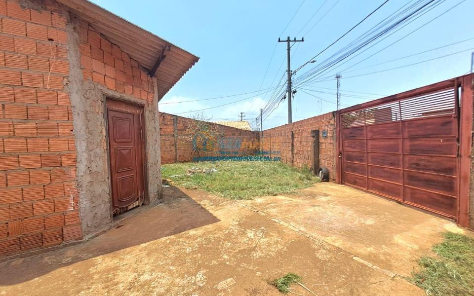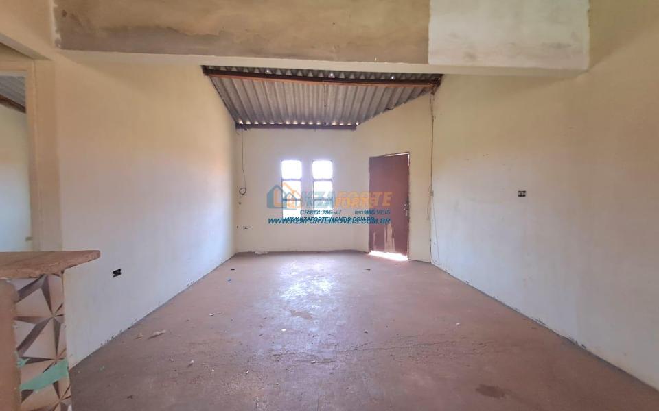 Casa rebocada e pintada por dentro, sem forro, telha de fibrocimento, piso de cimento queimado, contém sala e cozinha americana, dois quartos, banheiro social, varanda nos fundos e área de serviço. Terreno amplo medindo 17,01m de frente, 29,60m do lado direito, 21,57m do lado esquerdo e 15,00m nos fundos. Bastante espaço nos fundos para área gourmet ou até construir outra casa. Não financia.