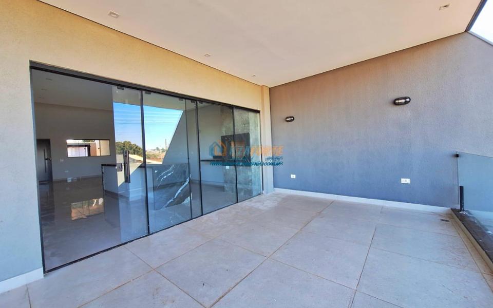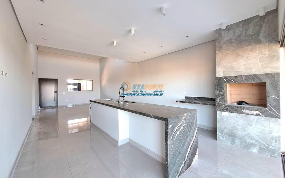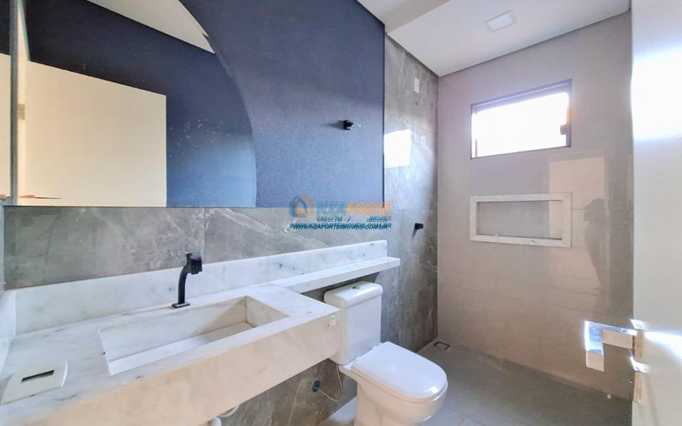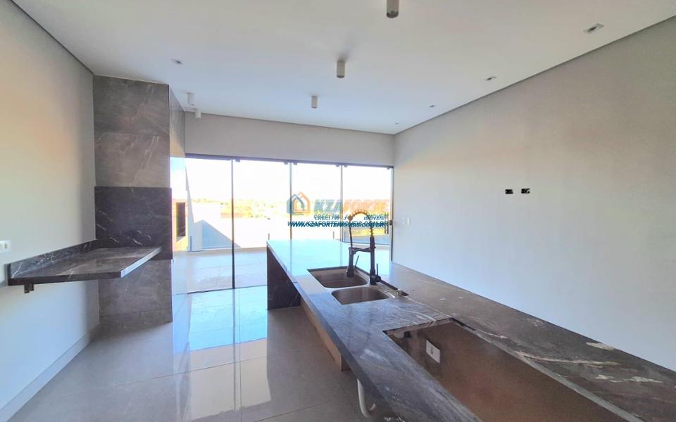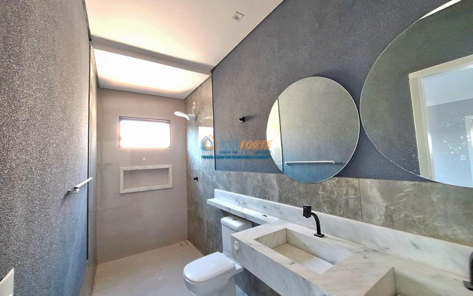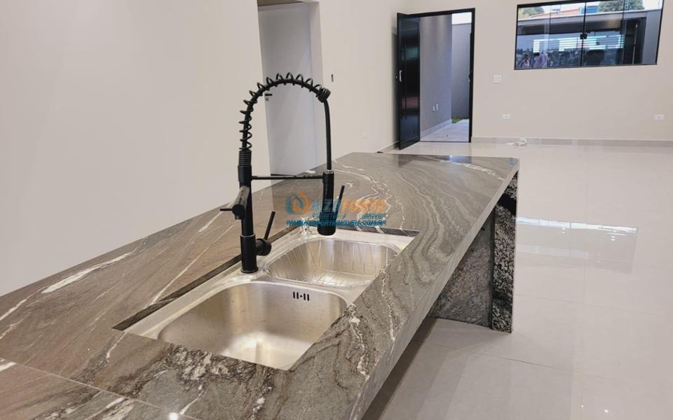 Excelente casa de alto padrão, sala com pé direito alto sendo para 2 ambientes integrada à cozinha gourmet com churrasqueira com bancada lateral e ilha em bancada com mármore Inter Wood e cuba dupla com torneira gourmet, fino acabamento com piso e revestimento em porcelanato acetinado e polido, com projeto luminotécnico e iluminação natural proporcionando maior luminosidade, sacada ampla com vista para a cidade, porta de entrada com fechadura digital, esquadrias em alumínio preto fosco, suíte espaçosa com banheiro com pia dupla esculpida, box e rebaixamento em gesso com iluminação em led, banheiro social com pia esculpida, box e rebaixamento em gesso. Imóvel possui duas frentes, garagem com forro madeira. Forro 50% de laje e 50% gesso acartonado. Aceita financiamento.