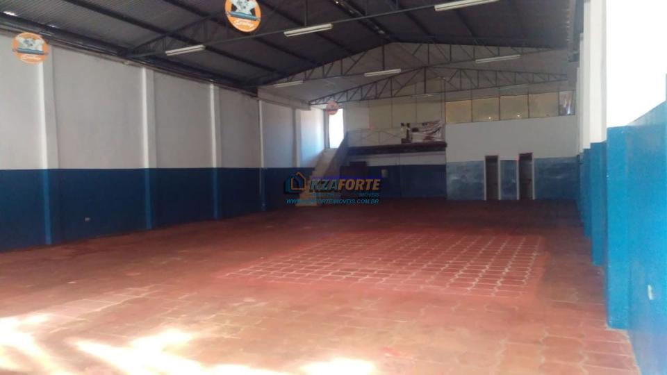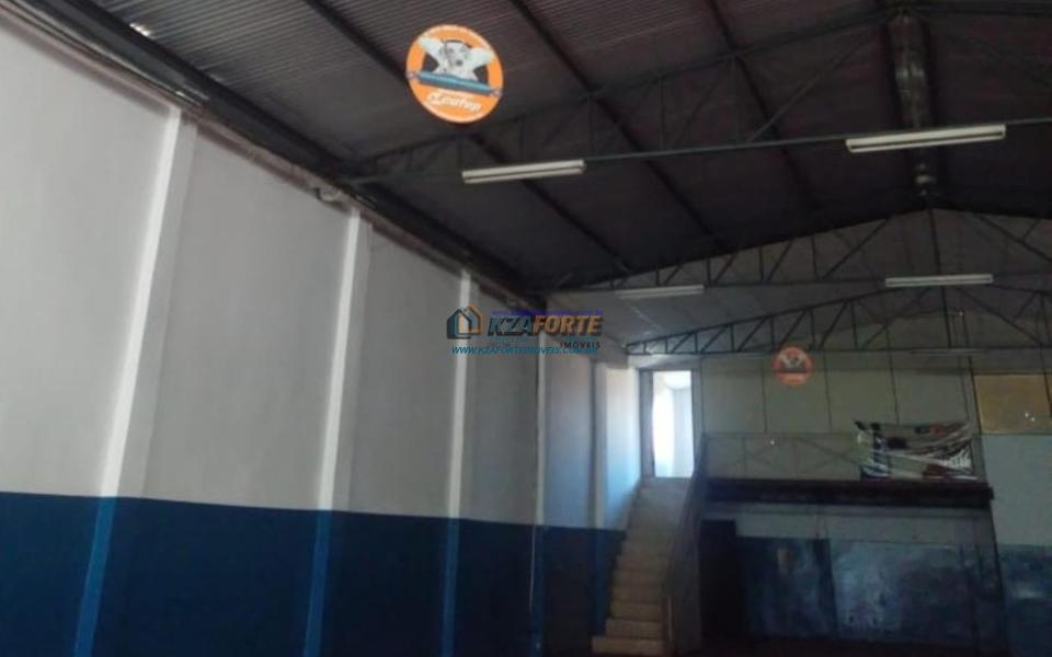 Salão comercial com pé direito medindo 5,5 metros de altura, não é pré-moldado, metade forrado, com telhado metálico, dois banheiros com vários vasos e chuveiro, mezanino, duas salas e escada de ferro.